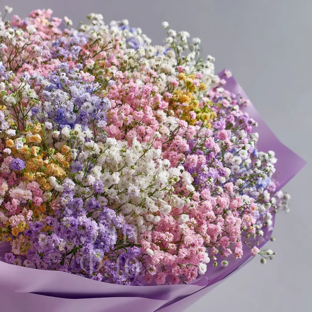Богатая, объёмная структура создаёт ощущение цветочной волны. Гипсофила выглядит воздушно и динамично, а букет дарит настроение яркого торжества.