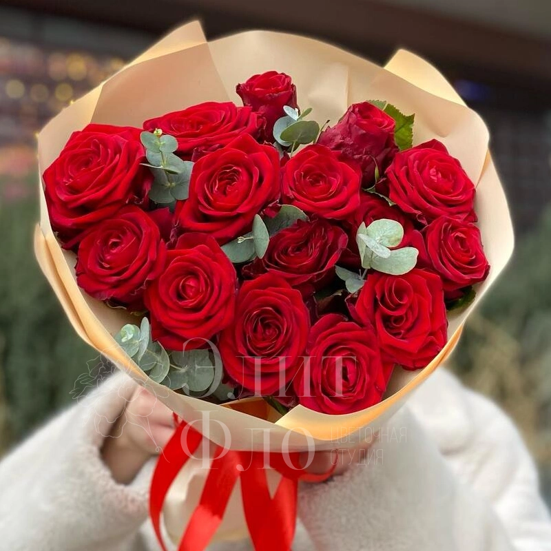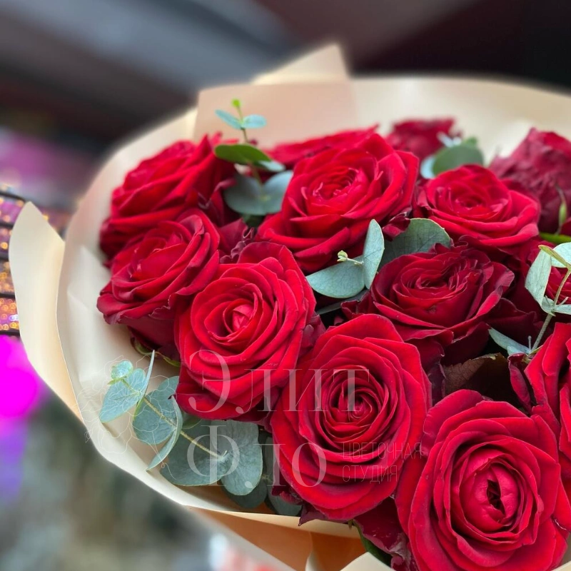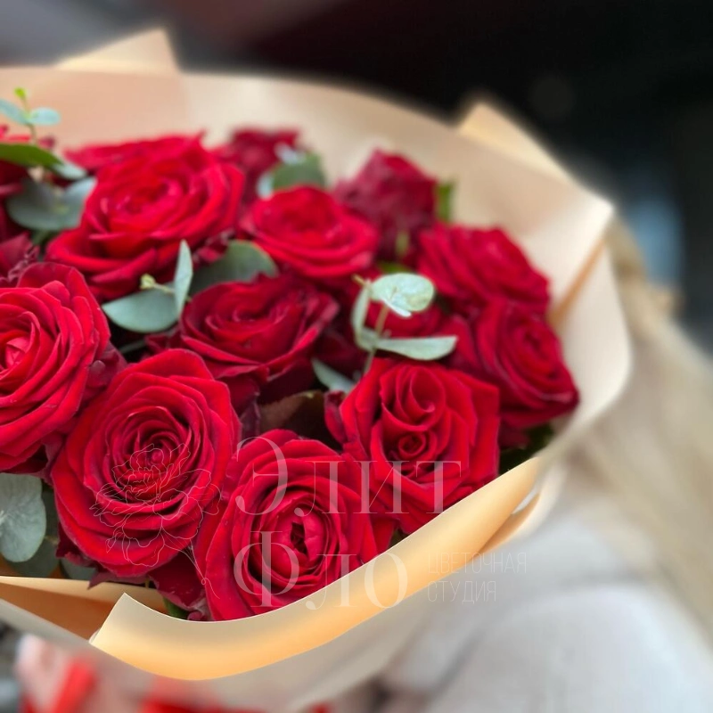 Бордовые розы и эвкалипт