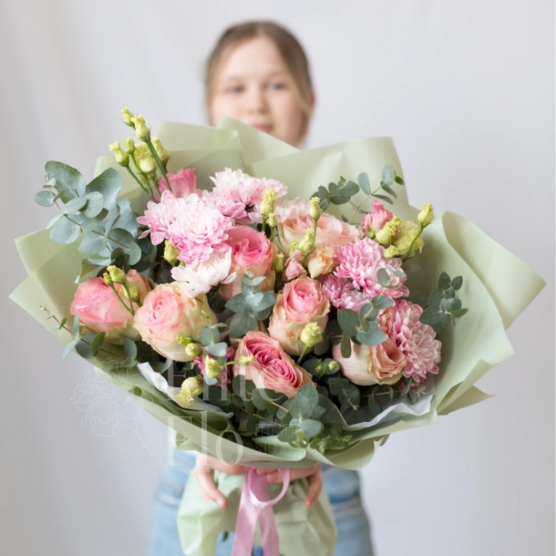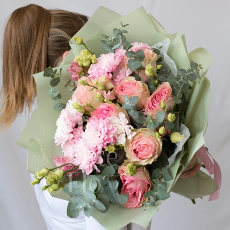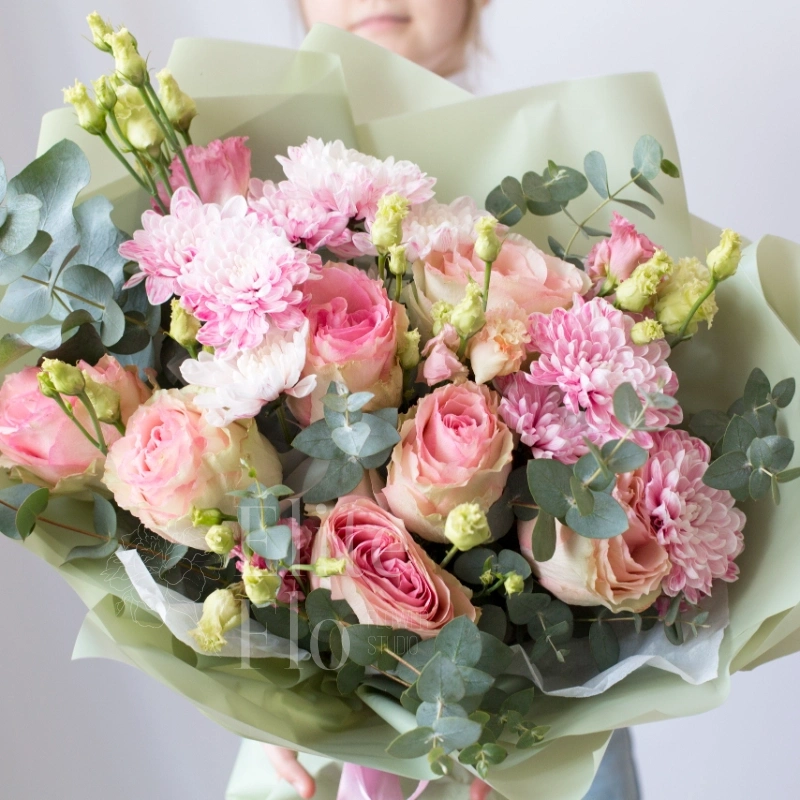 Букет роз, хризантем и лизиантусов