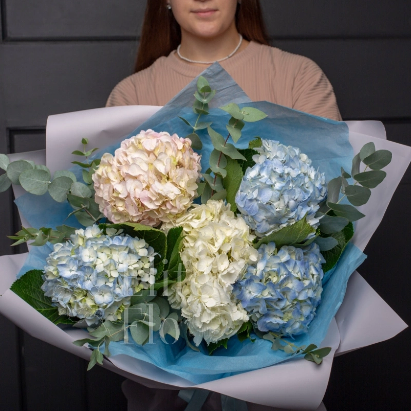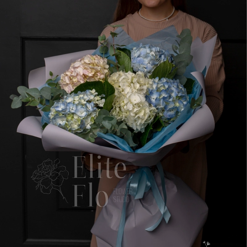 💐 Нежный, романтичный букет Гортензий и ароматного эвкалипта. Соцветия пудровых оттенков, что придаёт этому букету особую нежность🚘мы гарантируем доставку точно к выбранному вами времени.☎ При необходимости созвонимся с получателем и уточним адрес и время доставки. К каждому букету мы прикладываем средство для продления жизни цветов,инструкцию по уходу за цветами и... аромосаше с ненавязчивым стойким ароматом, который вызовет улыбку на лице вашей получательницы)🌹Подготовьте вазу с чистой холодной водой🌹добавьте средство для продления жизни цветов🌹подрежьте стебли🌹 расположите букет вдали от отопительных приборов и сквозняков🌹не забывайте менять или доливать чистую воду❤‍🔥К этому букету мы можем предложить вам вазу, открытку,гелевые шарики,мягкую игрушку,сладости,фруктовую корзину,наборы шоколада и чая.