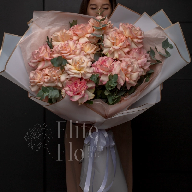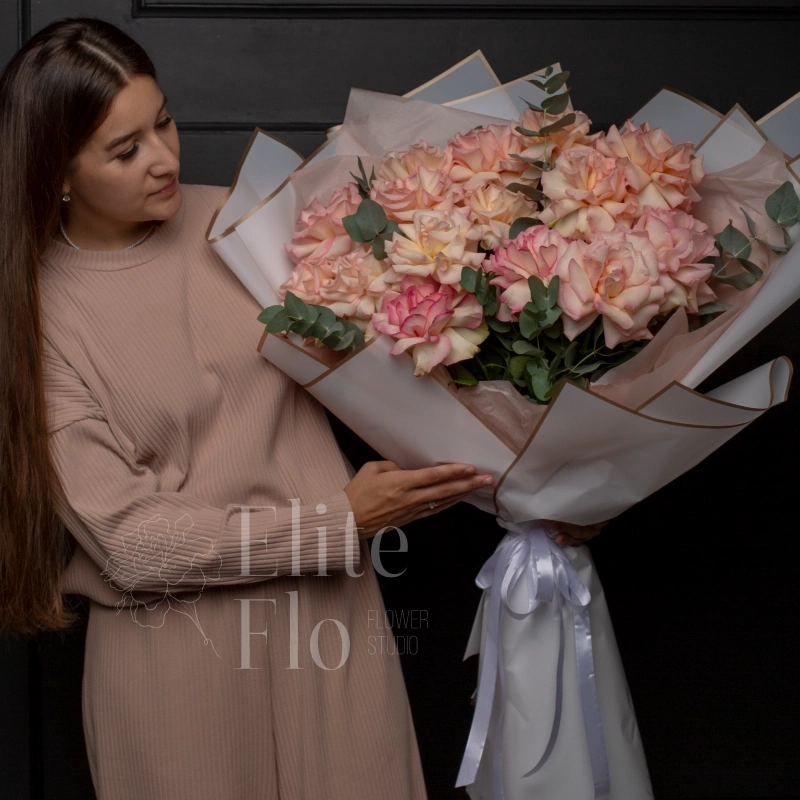 ГлавнаяКаталогБукетыФранцузские розы с ароматным эвкалиптом, стильное оформление