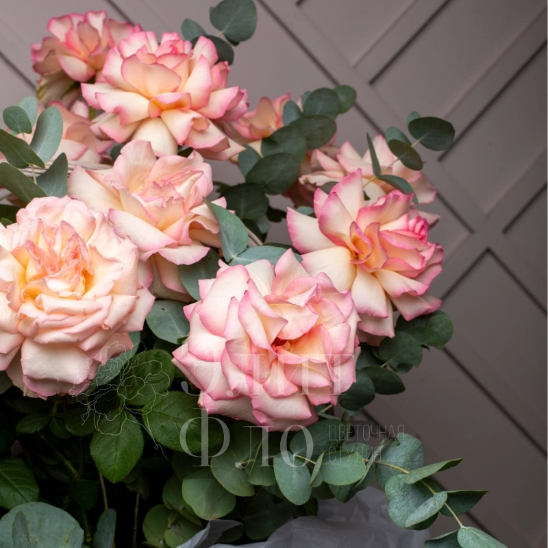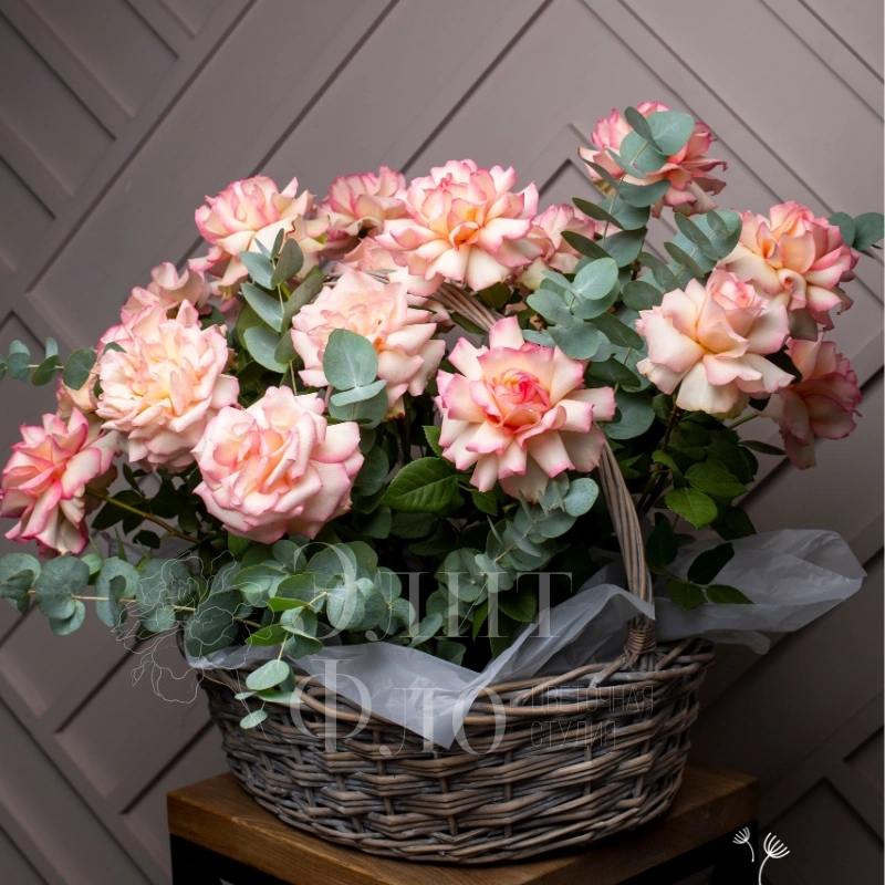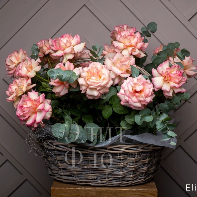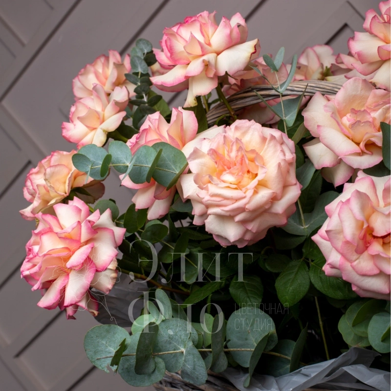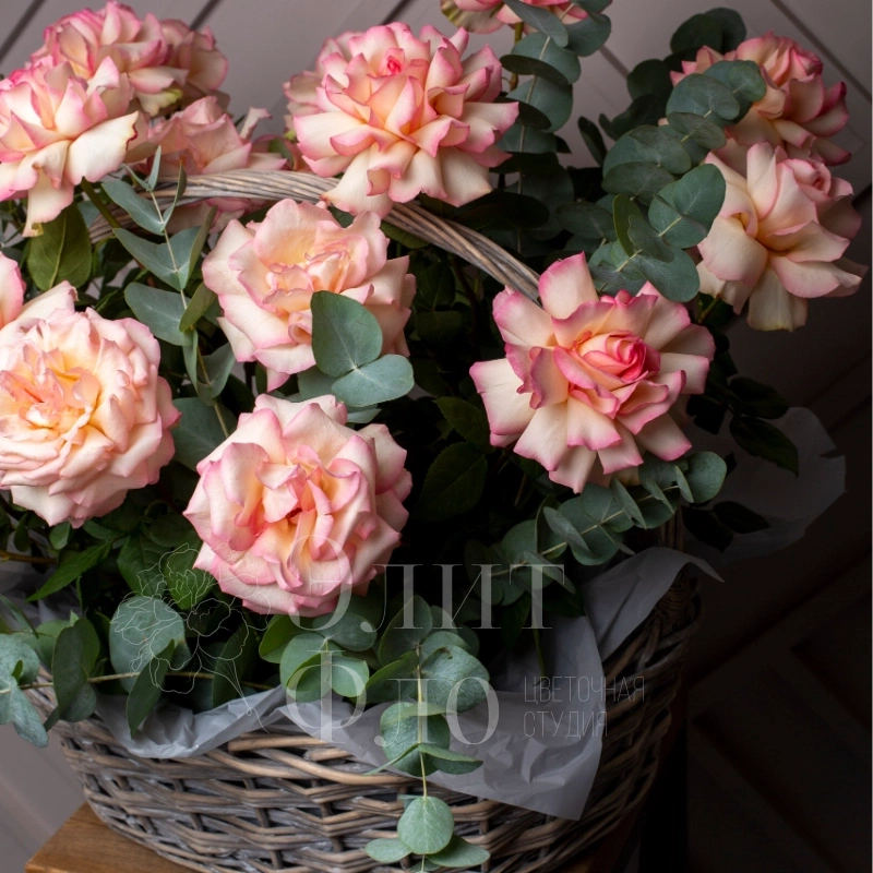 Потрясающая корзина из 21 Французской розы и Эвкалипта