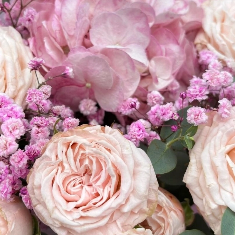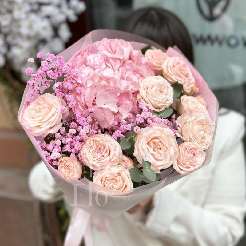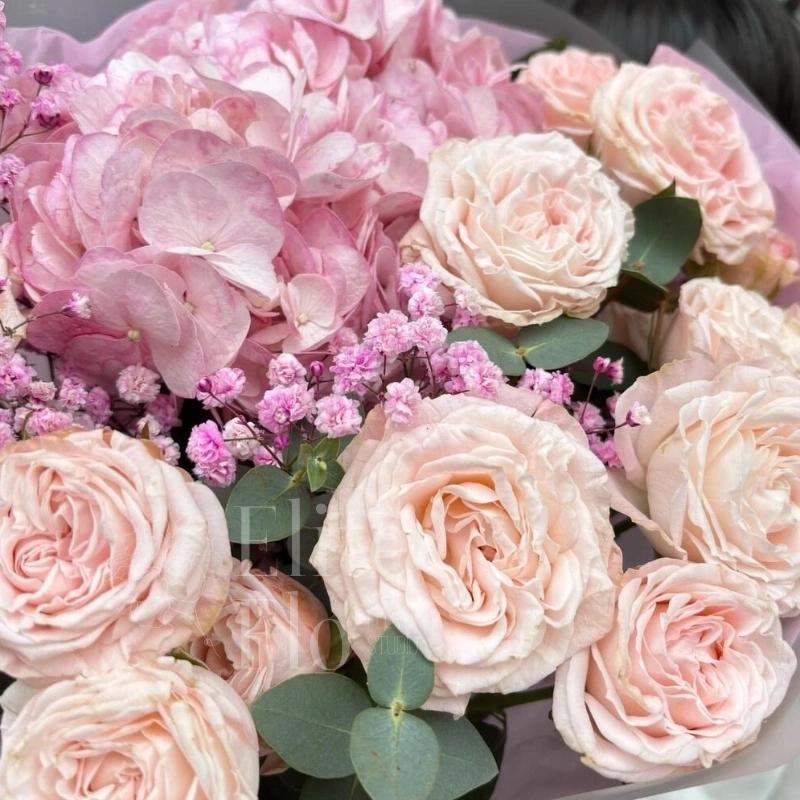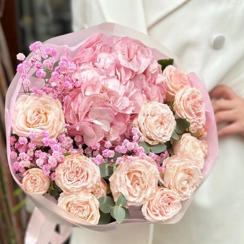 Гипсофила - 1 шт.Гортензия - 1 шт.Эвкалипт - 3 шт.Роза кустовая пионовидная - 3 шт.Упаковка дизайнерская - 1 шт. зелень декоративная - 3 шт
