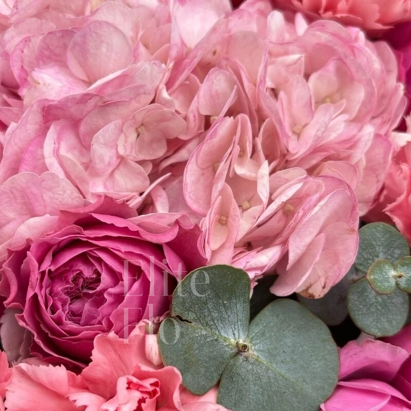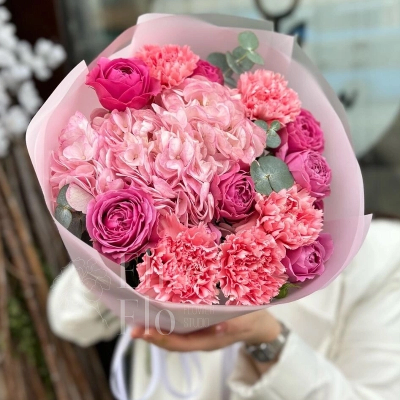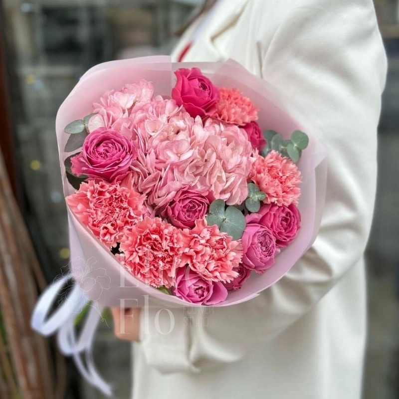 Букетик подойдет для любого повода и для любого получателя, будь то 14 февраля, 8 марта, 1 сентября, День учителя, день рождения, свидание или свадьба.Гортензия - 1 шт.Эвкалипт - 3 шт.Лента атласная - 1 шт.Диантус - 5 шт.Роза кустовая пионовидная - 3 шт.Пленка матовая - 3 шт. зелень декоративная - 3 шт