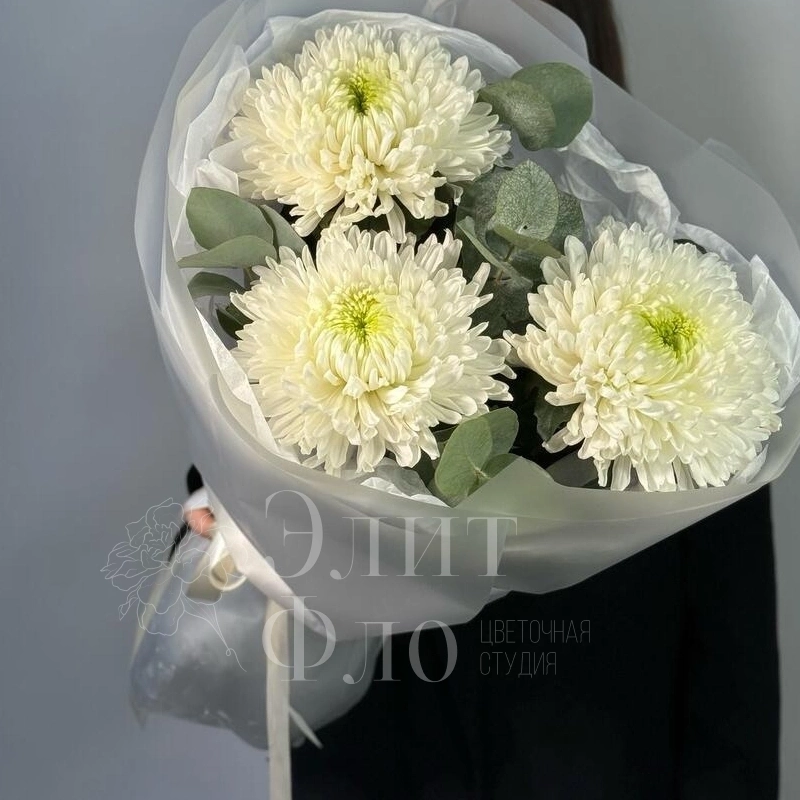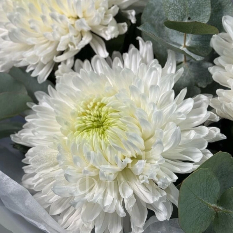 букет из белых хризантем. Цветы аккуратно собраны и упакованы в матовую пленку, которая позволяет видеть их красоту. В букете также присутствуют зеленые листья эвкалипта, которые добавляют свежести и контраста. Букет перевязан белой лентой, что придает ему завершенный и элегантный вид.