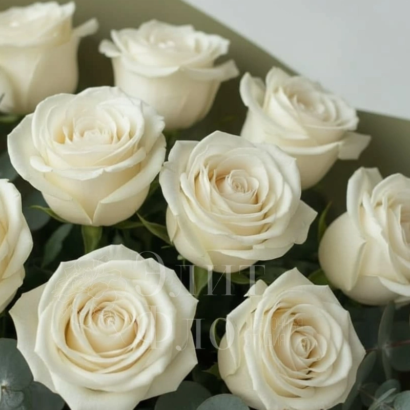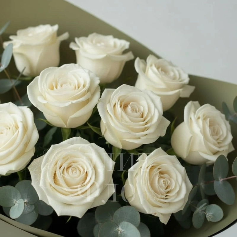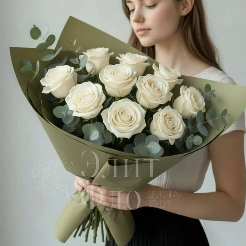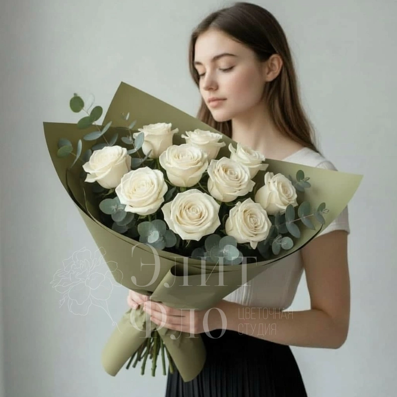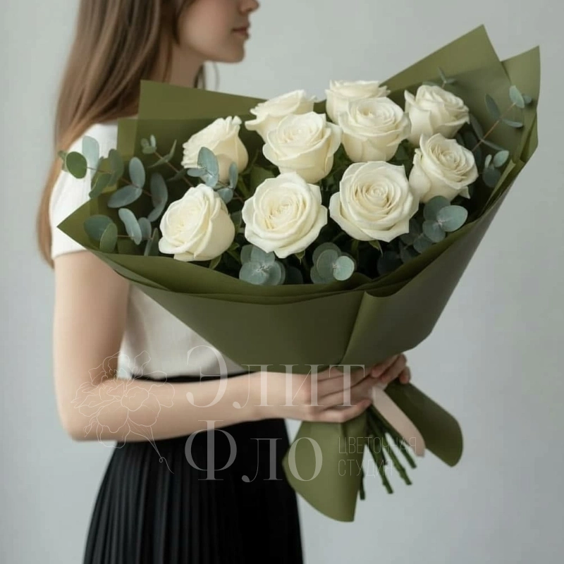 Букет из 11 белых роз в оливковой упаковке
