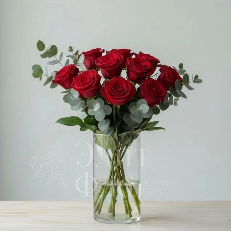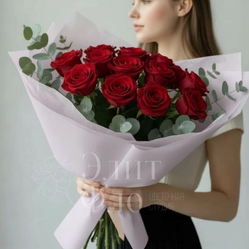 ГлавнаяКаталогРозыБукет из 13 красных роз с эвкалиптом