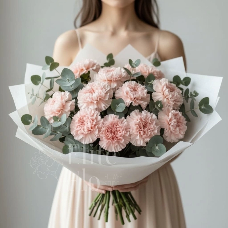 ГлавнаяКаталогБукетыБукет из 15 розовых диантусов и эвкалипта