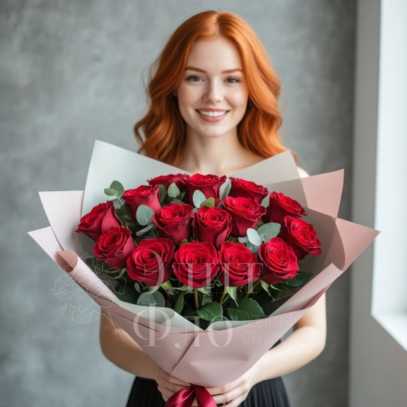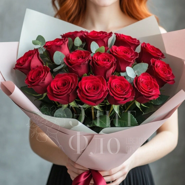 Букет из 17 красных роз Букет из 17 свежих, эквадорский роз темно-красного цвета с добавлением эвкалипта. Такой букет станет романтичным подарком для второй половинки, а также отличным решением для выражения благодарности и восхищения. Великолепные темно-красные розы никого не оставят равнодушными и надолго сохраняют свежесть.