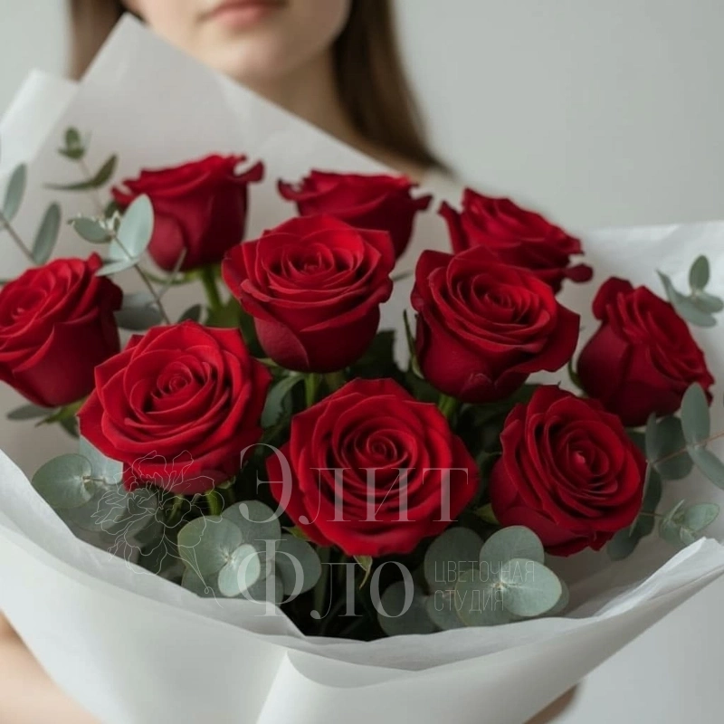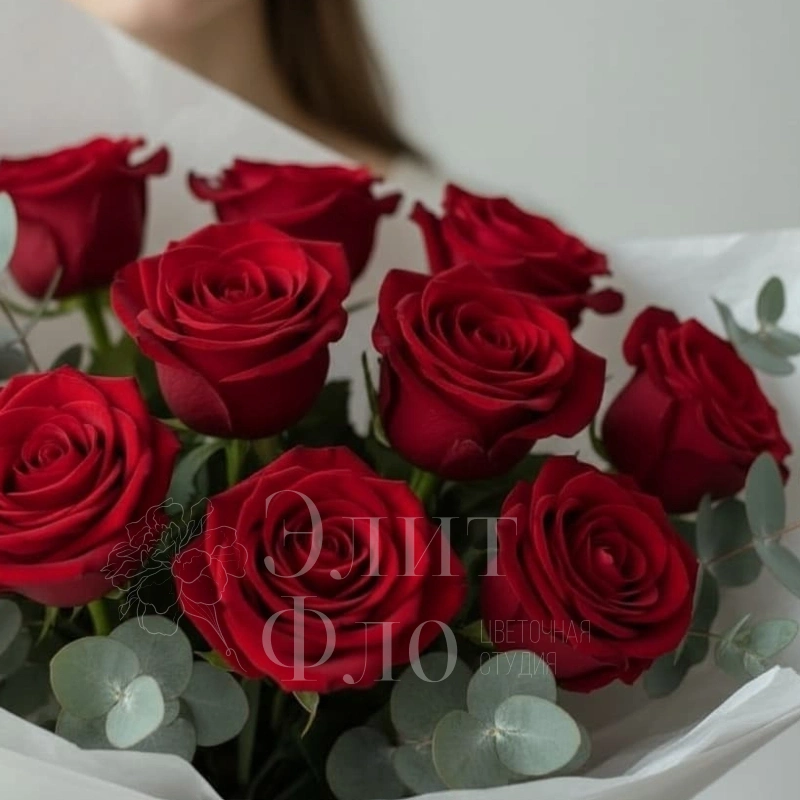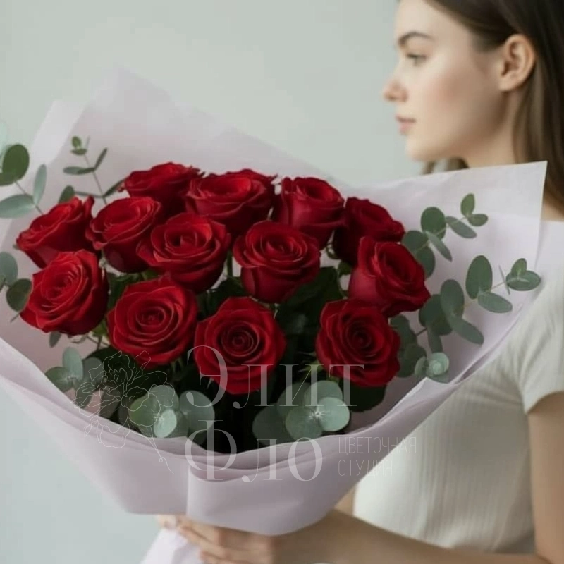 Описание букета Букет из 15 роскошных красных роз, элегантно дополненный изумрудной эвкалиптовой зеленью и оформленный в белую упаковку, станет идеальным подарком для самых дорогих и близких. Этот букет воплощает страсть и любовь, наполняя пространство яркой элегантностью и нежностью.