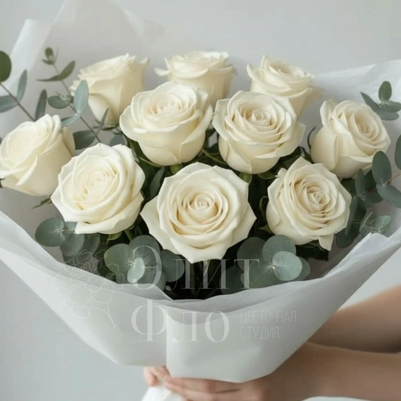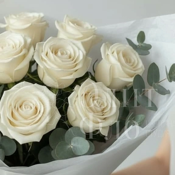 Описание букета Нежный букет из белых роз с добавлением эвкалипта - воплощение элегантности и безупречного вкуса. Композиция излучает свежесть, легкость и гармонию, создавая ощущение спокойствия и умиротворения. Букет станет прекрасным подарком для любого торжества.