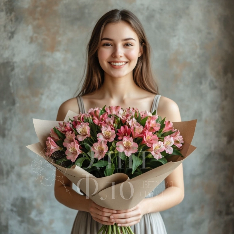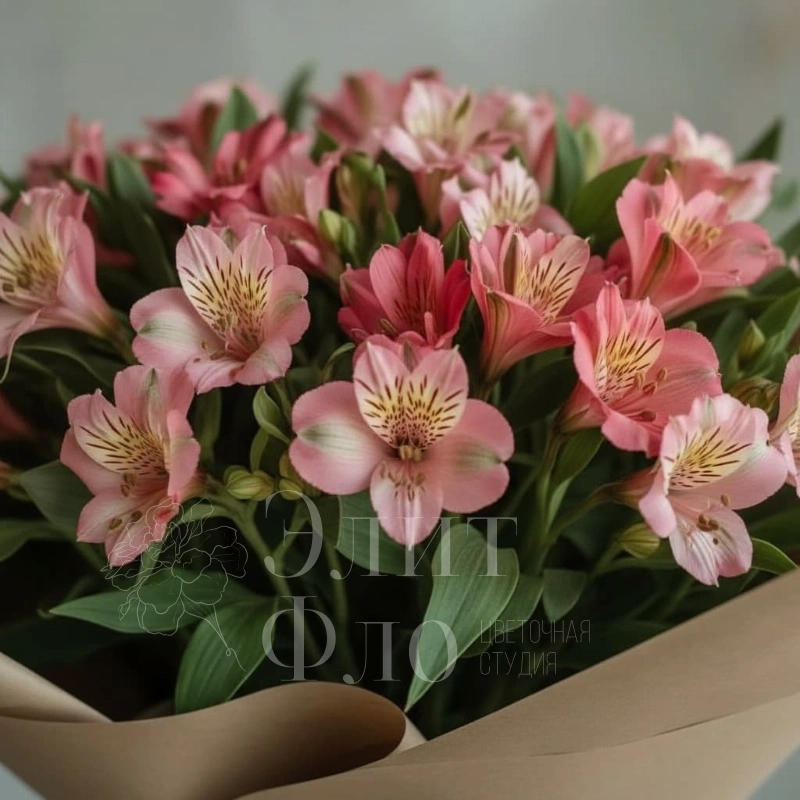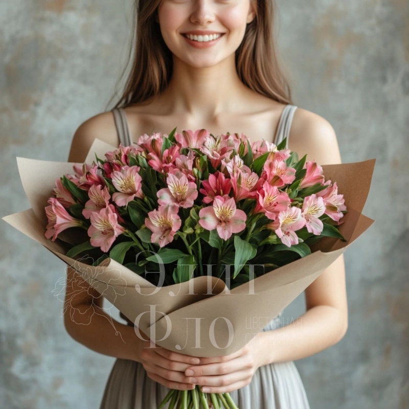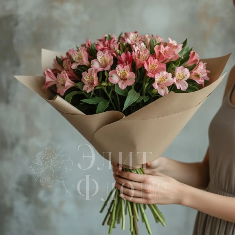 Букет нежных розовых альстромерий, завёрнутый в натуральную бумагу, излучает тепло и лёгкость. Эти цветы символизируют дружбу, преданность и искренность, делая букет прекрасным подарком для близких. Простота упаковки подчёркивает естественную красоту цветов.