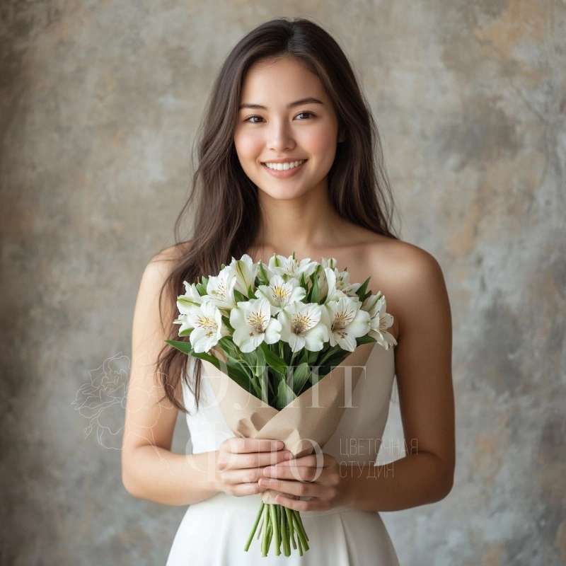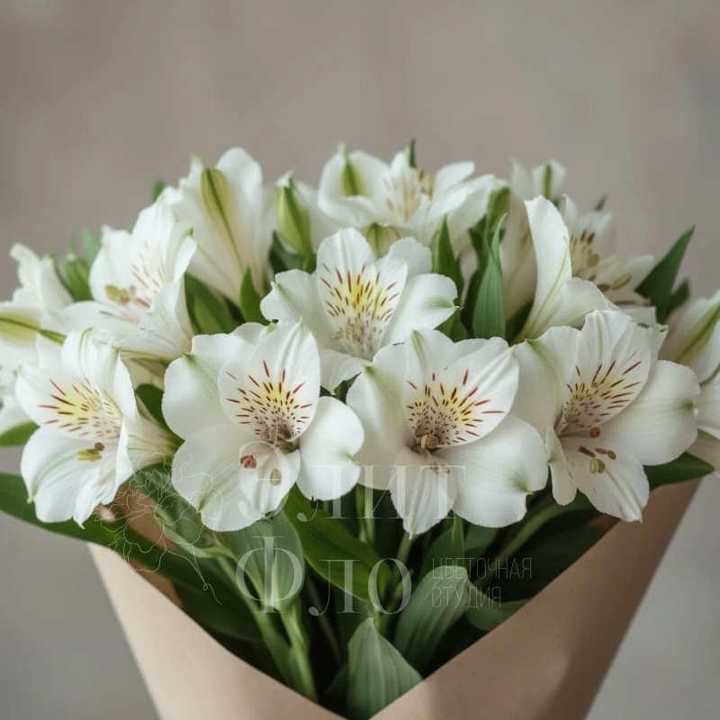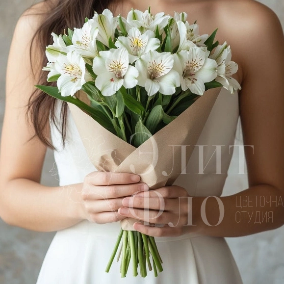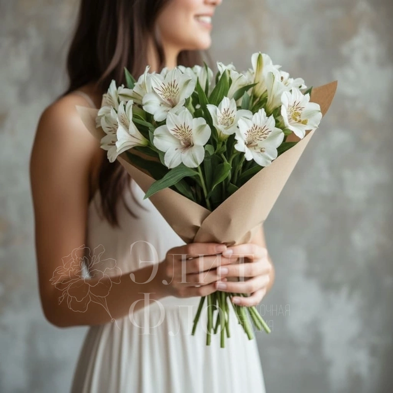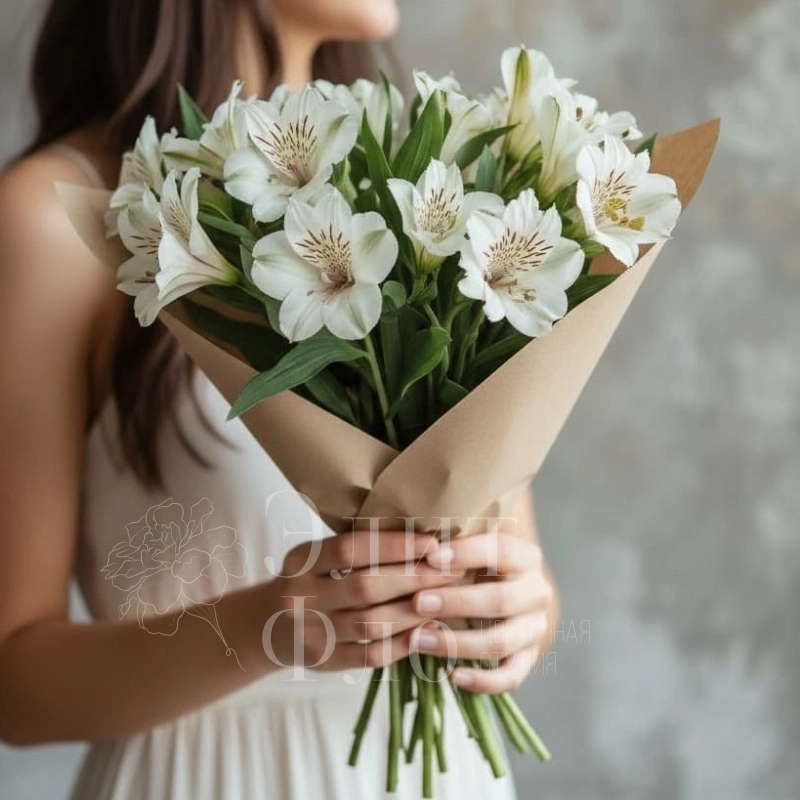 Нежный букет белых альстромерий, элегантно упакованный в натуральную бумагу, станет прекрасным подарком для любого торжества. Свежие цветы с тонким ароматом и изящными лепестками привнесут в интерьер легкость и свежесть. Букет идеально подойдет для романтического свидания, свадьбы или просто как знак внимания и заботы.