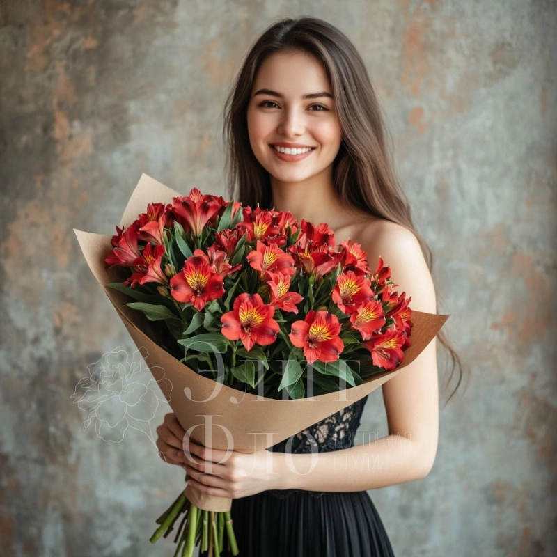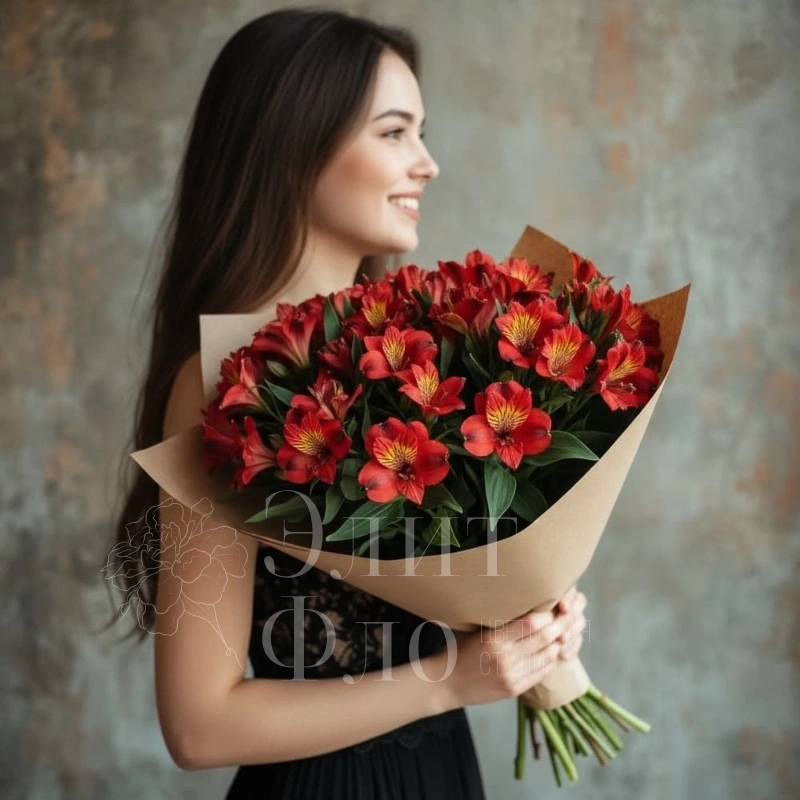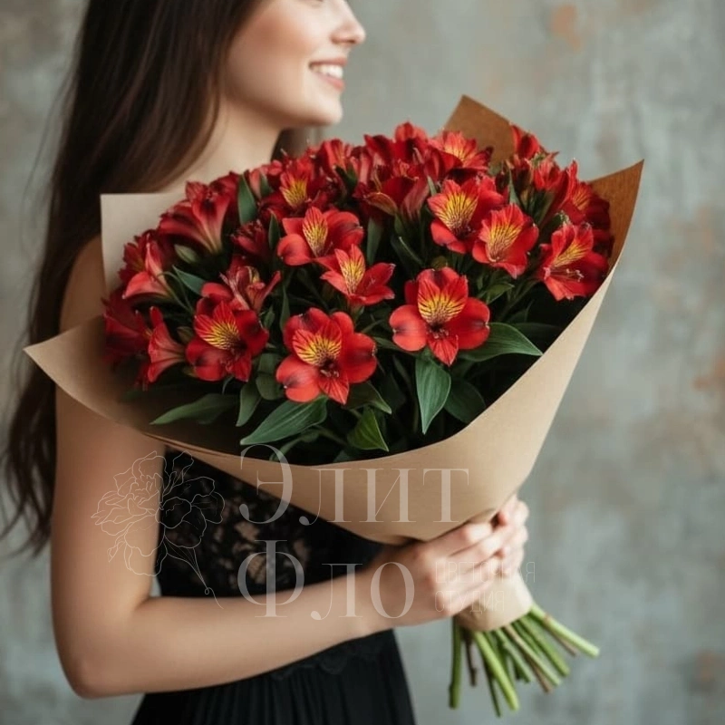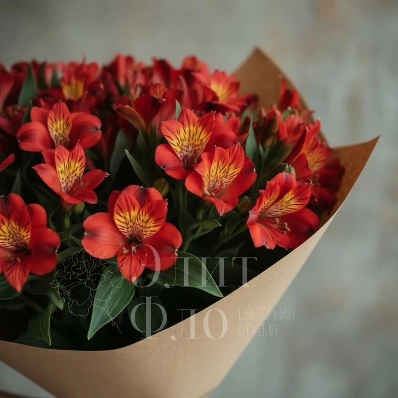 Букет из красных альстромерий, элегантно упакованный в коричневую бумагу, станет ярким акцентом в любом интерьере. Нежные цветы с контрастными желтыми тычинками придают композиции особую выразительность и изящество. Этот букет станет прекрасным подарком для тех, кто ценит страсть и элегантность.
