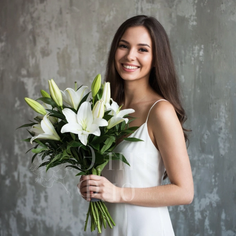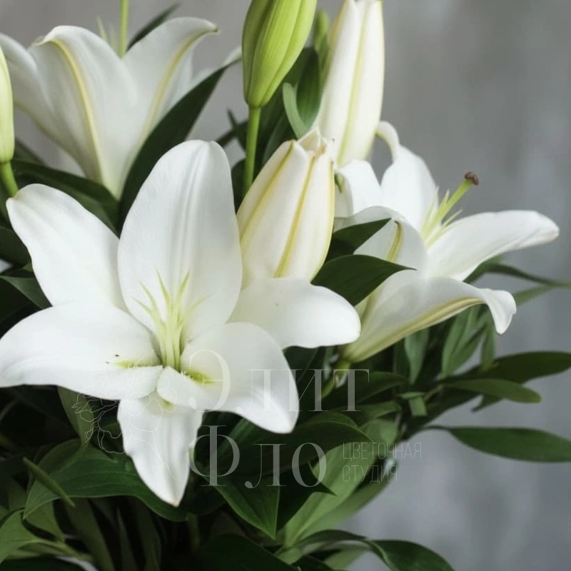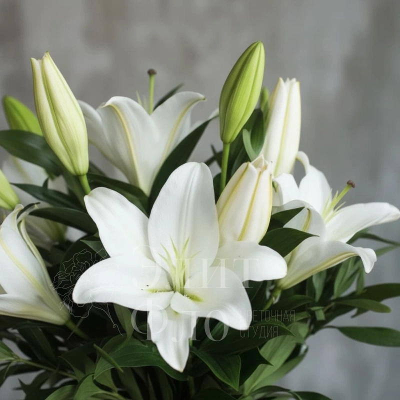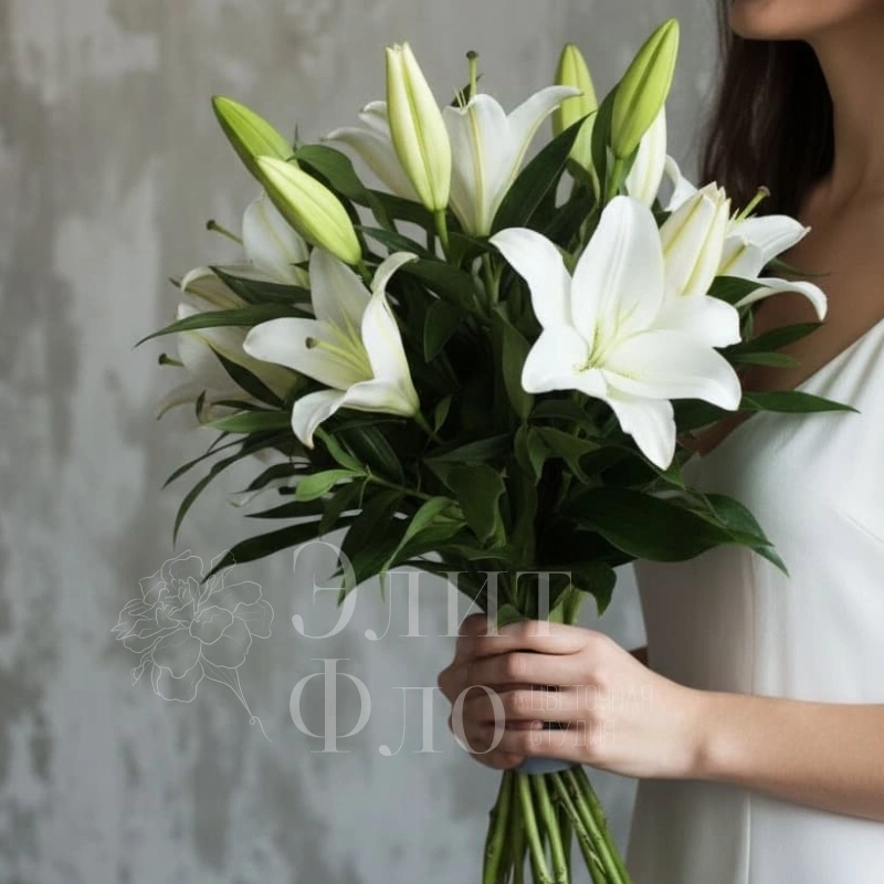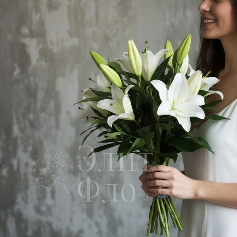 Букет из белых лилий с нежными цветками и яркими зелеными листьями, источающий тонкий аромат и элегантность. Этот букет станет прекрасным подарком для особого случая и привнесет в интерьер атмосферу чистоты, торжественности и гармонии. Красивые белые лилии никого не оставят равнодушным!