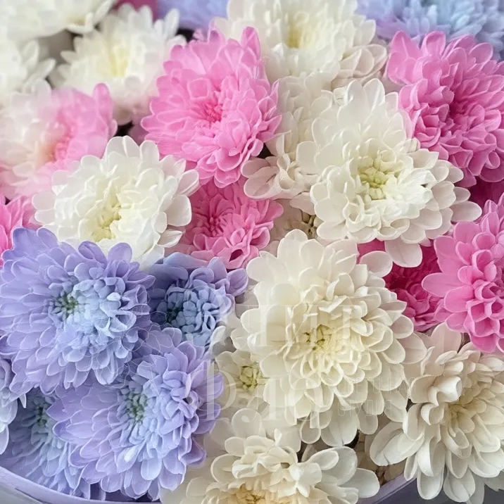 Нежный букет из кустовых хризантем в пастельной гамме: белоснежные, нежно-розовые и светло-фиолетовые цветы гармонично сочетаются друг с другом. Объёмная, воздушная композиция аккуратно упакована в полупрозрачную бумагу, дополнена лёгкой лентой. Выглядит свежо и изысканно — идеальный выбор для поздравления или романтичного жеста.
