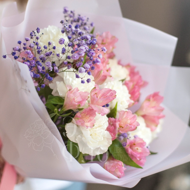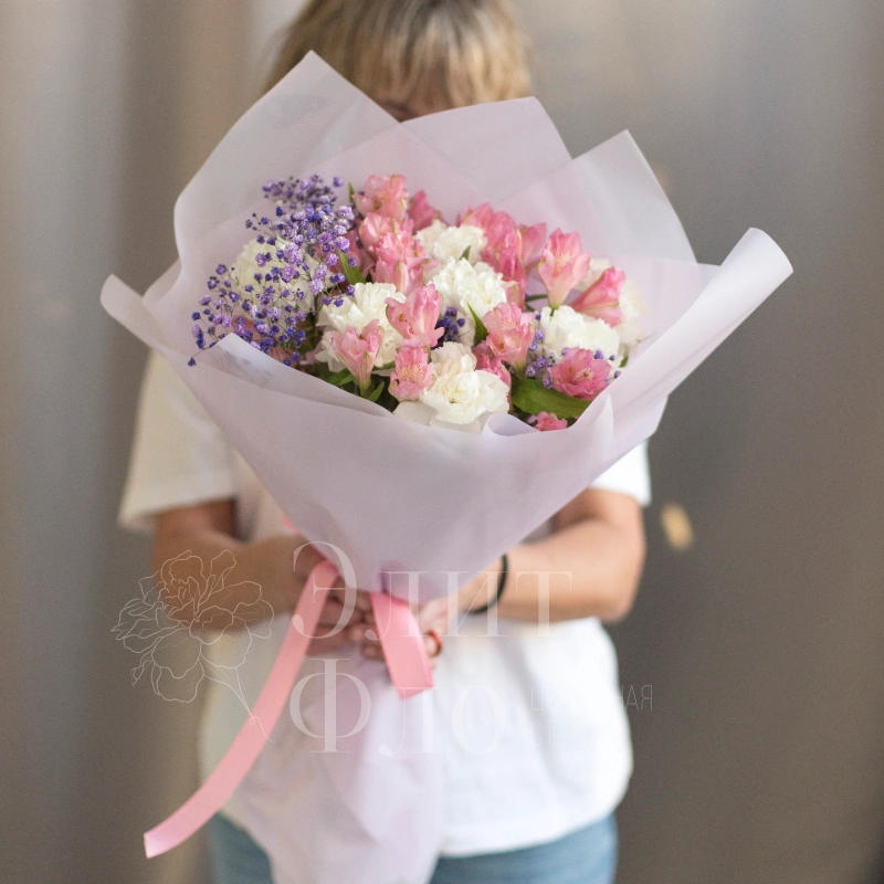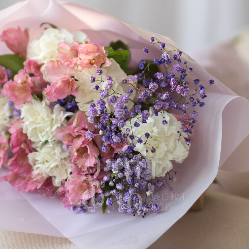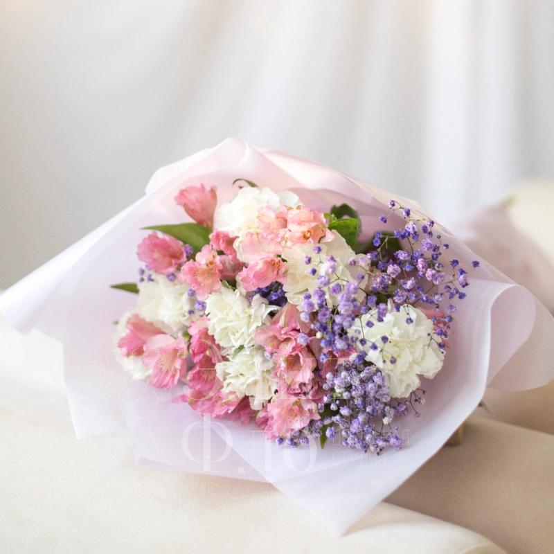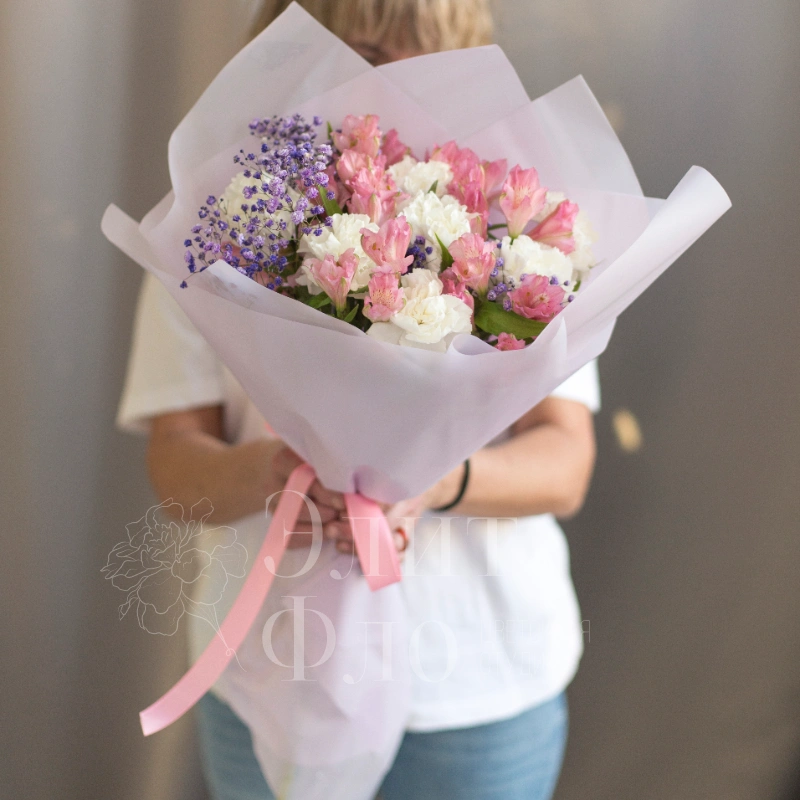 Нежный букет из розовых Альстромерий и белых диантусов с вкраплениями сиреневой гипсофилы, оформлен в полупрозрачную белую упаковку и перевязан розовой лентой — нежный и воздушный