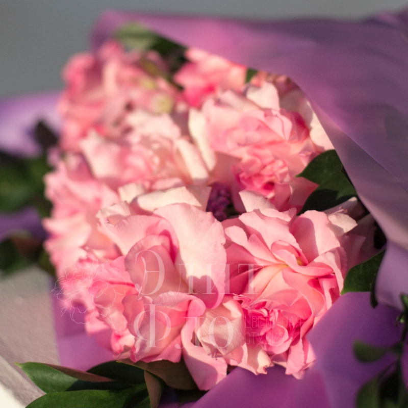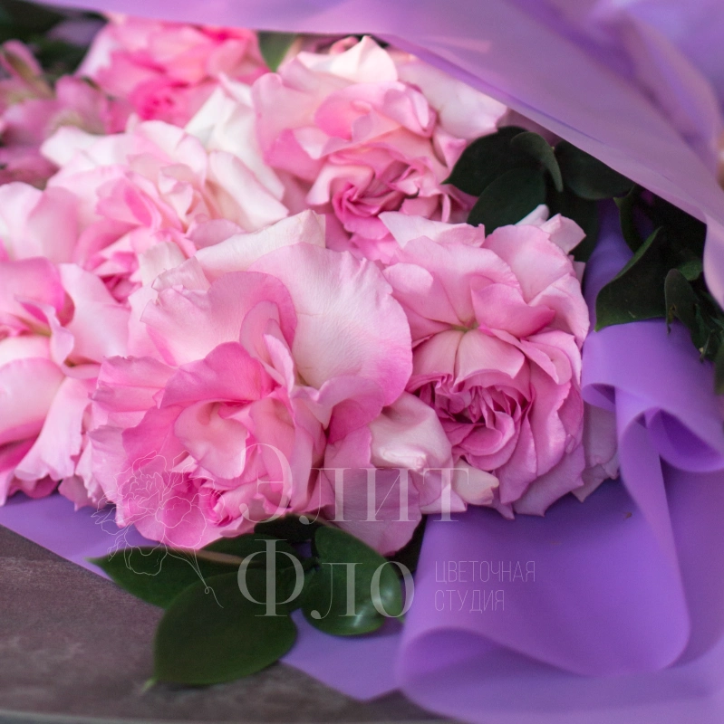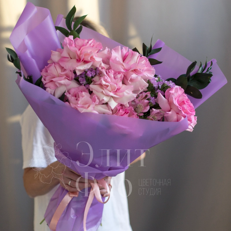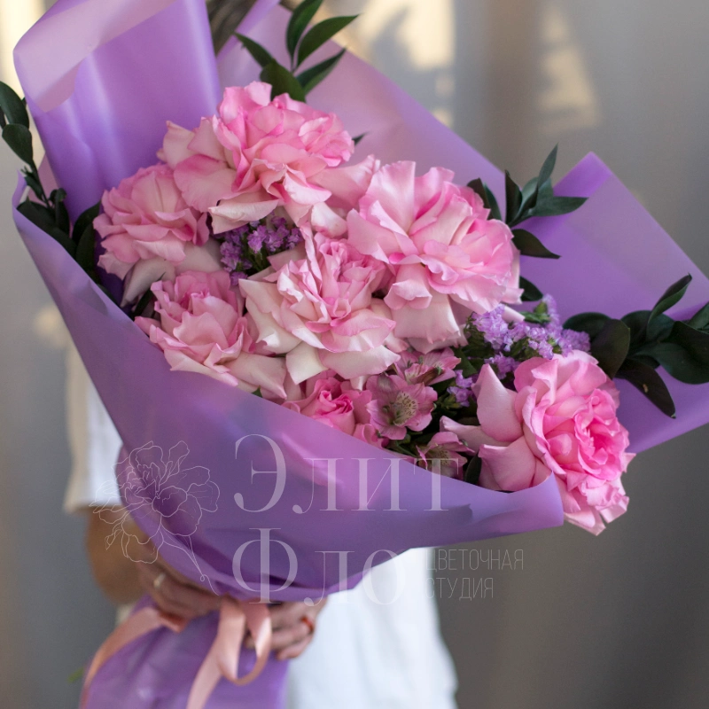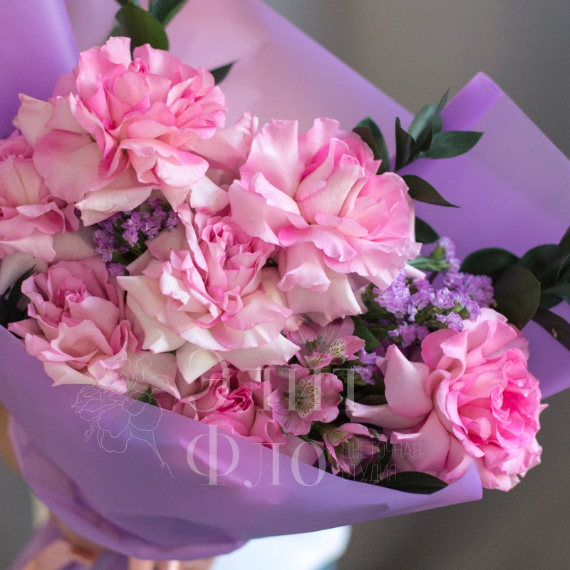 Этот букет сочетает в себе утончённость и свежесть: пышные розовые французские розы создают основной акцент, а изящная зелень и мелкие фиолетовые цветы статицы добавляют композиции лёгкости и глубины. Сиреневая упаковка подчёркивает нежность букета, а розовая лента придаёт ему завершённость и романтичность.