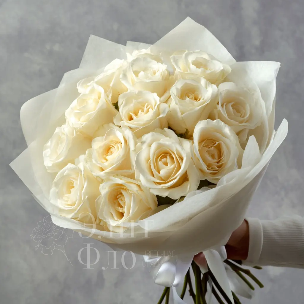 Невесомый и светлый букет из 15 белых роз высотой 40 см — символ чистоты и уважения. Идеален для официальных поздравлений, школьных мероприятий и трогательных моментов.