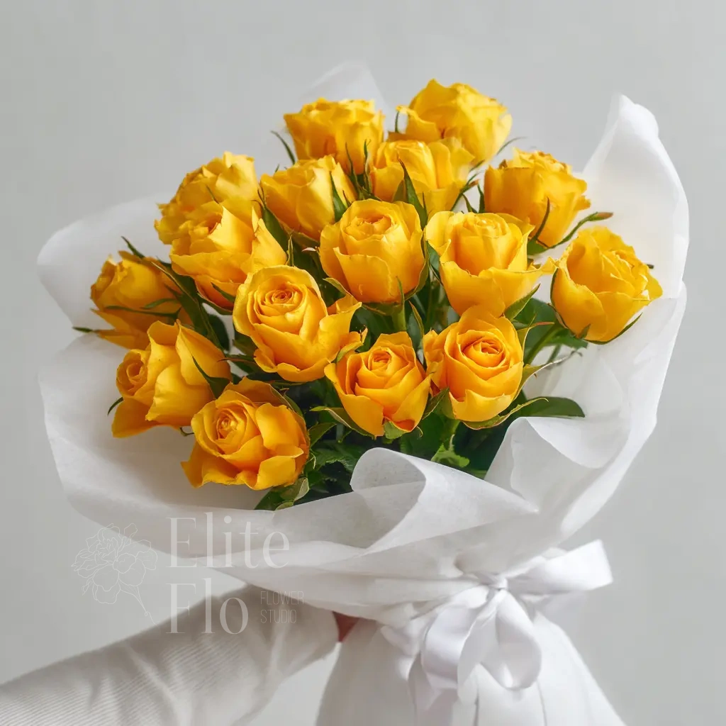 Яркий, солнечный букет из 15 жёлтых роз длиной 40 см. Символ радости, дружбы и позитива. Кенийские розы в этом исполнении станут отличным подарком коллеге, подруге или близкому человеку.