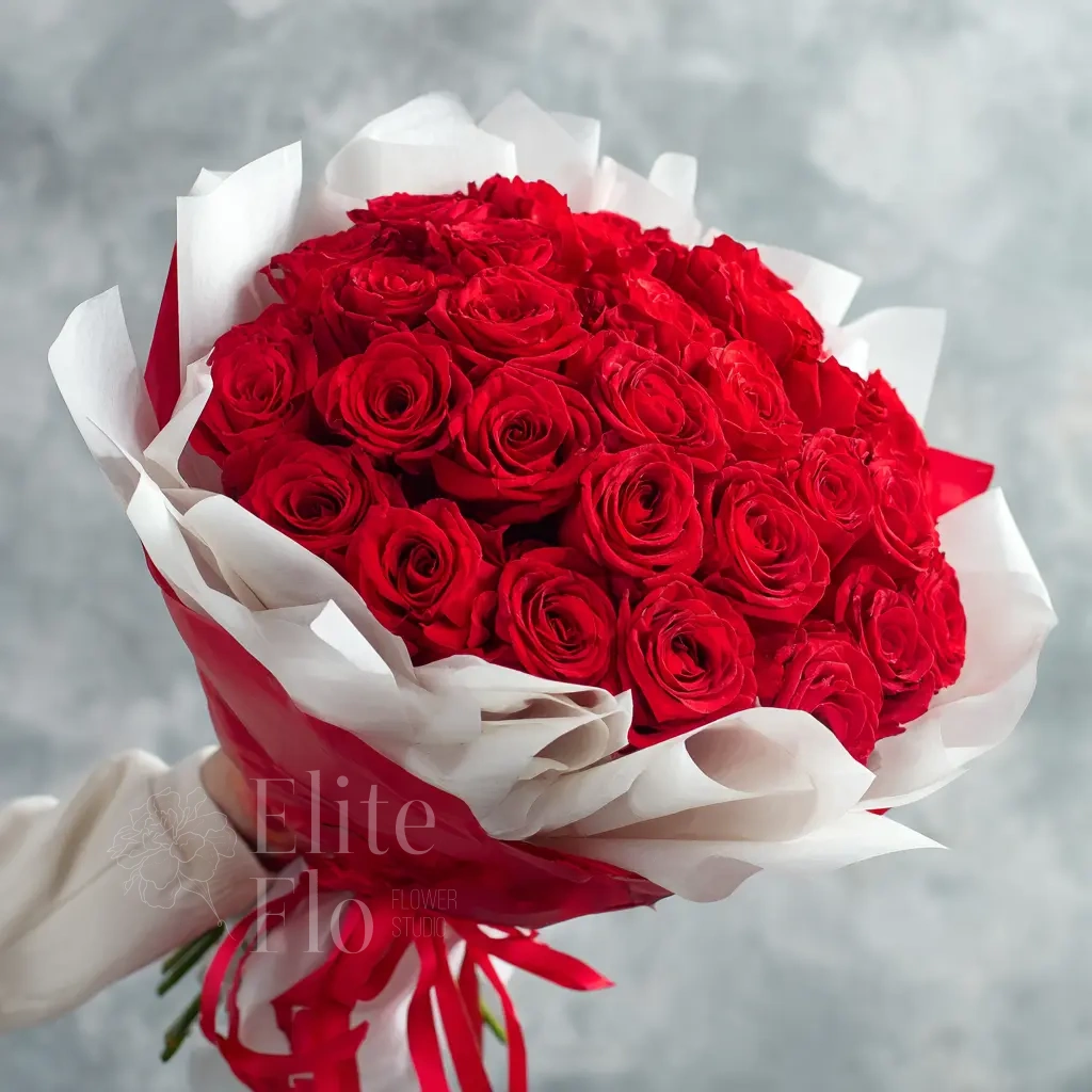 Элегантная композиция с насыщенными, карминовыми оттенками. Для женщин с характером и чувством стиля. Букет подчеркнёт уверенность дарителя и важность момента.